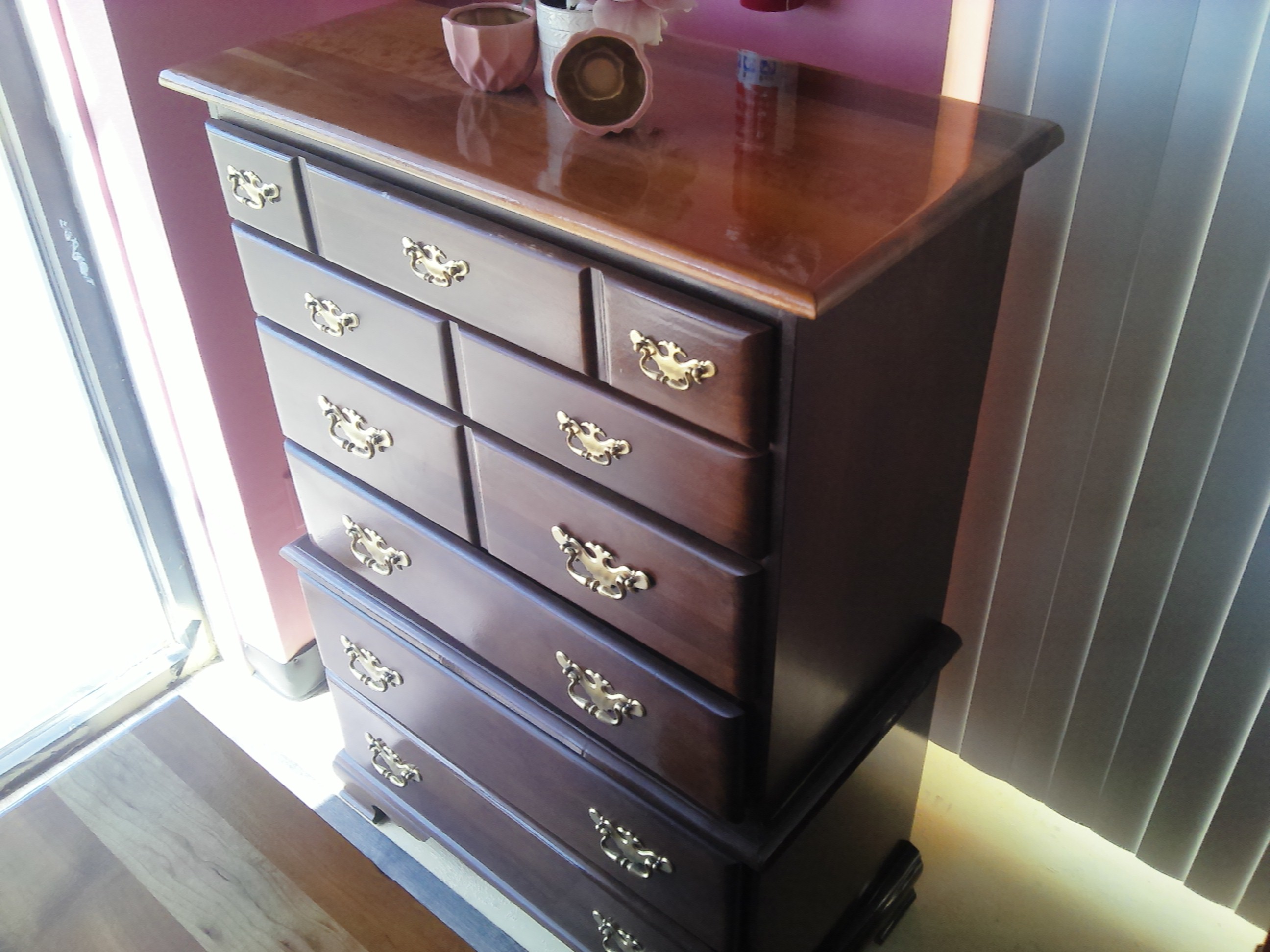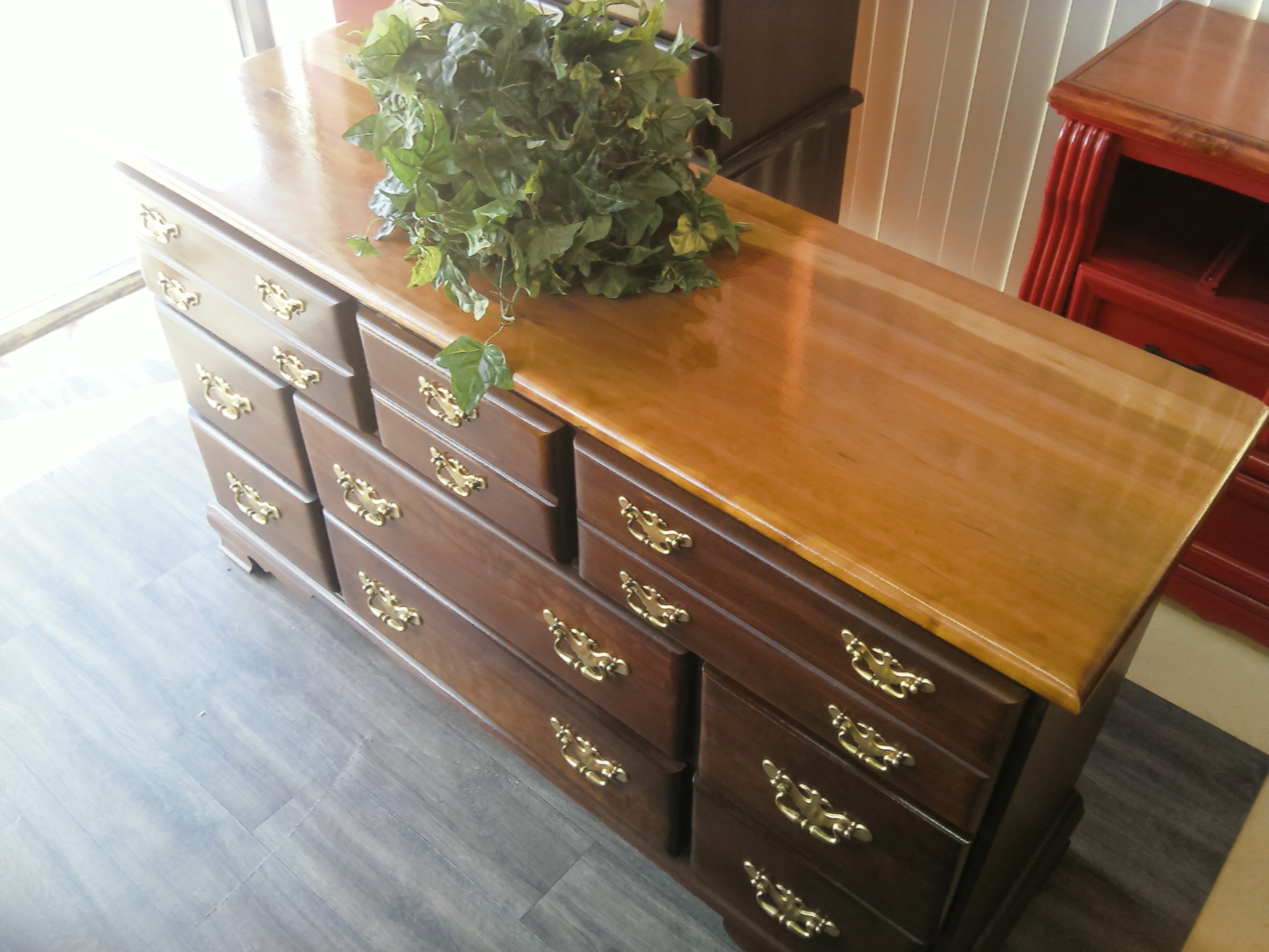 This piece has been painted in Earth tone Orange and the accent drawers have been sanded and stained in a chestnut brown.