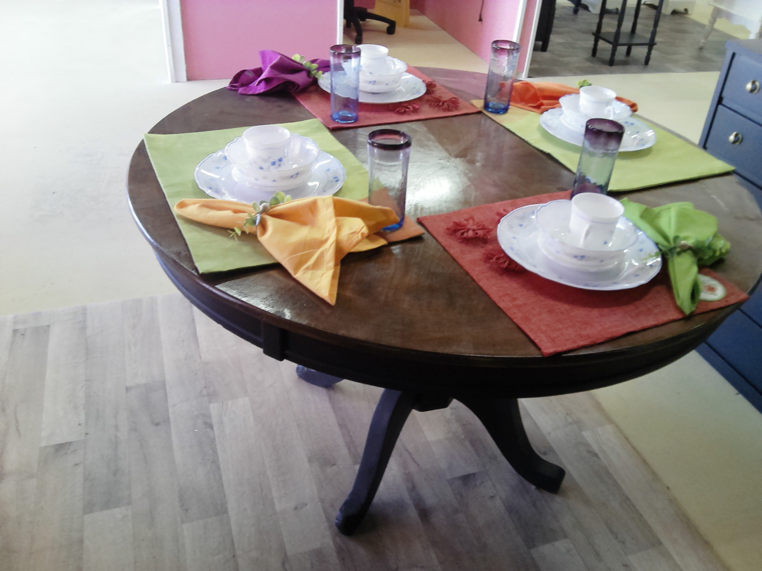 This beautiful set has been painted in a unique gold and the top has been sanded and stained to give a two toned look. Table comes with 6 chairs. Table and chairs are all wood. Table does have a leaf so size is adjustable.