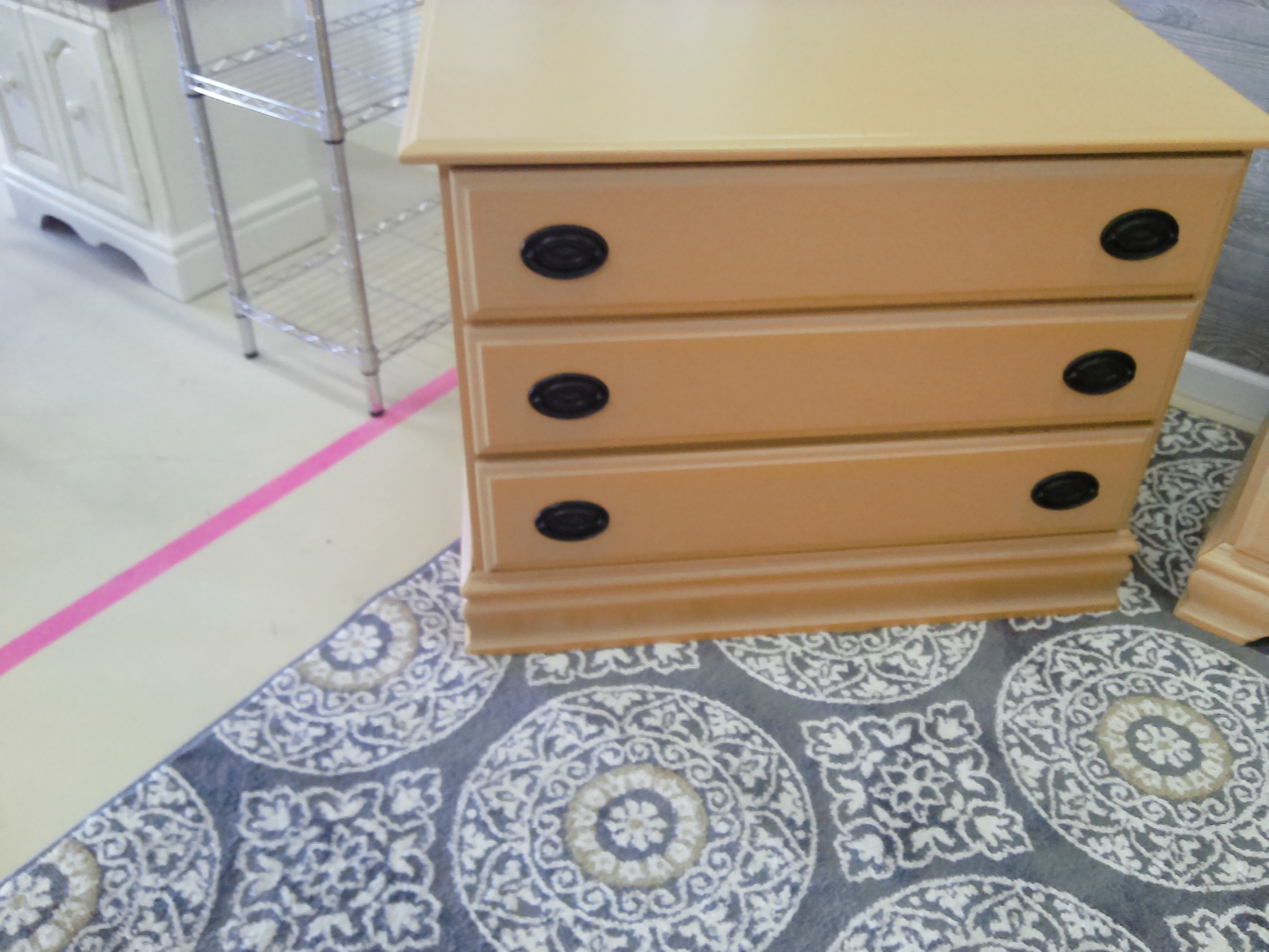 This piece has been painted in Earth tone Orange and the accent drawers have been sanded and stained in a chestnut brown.
