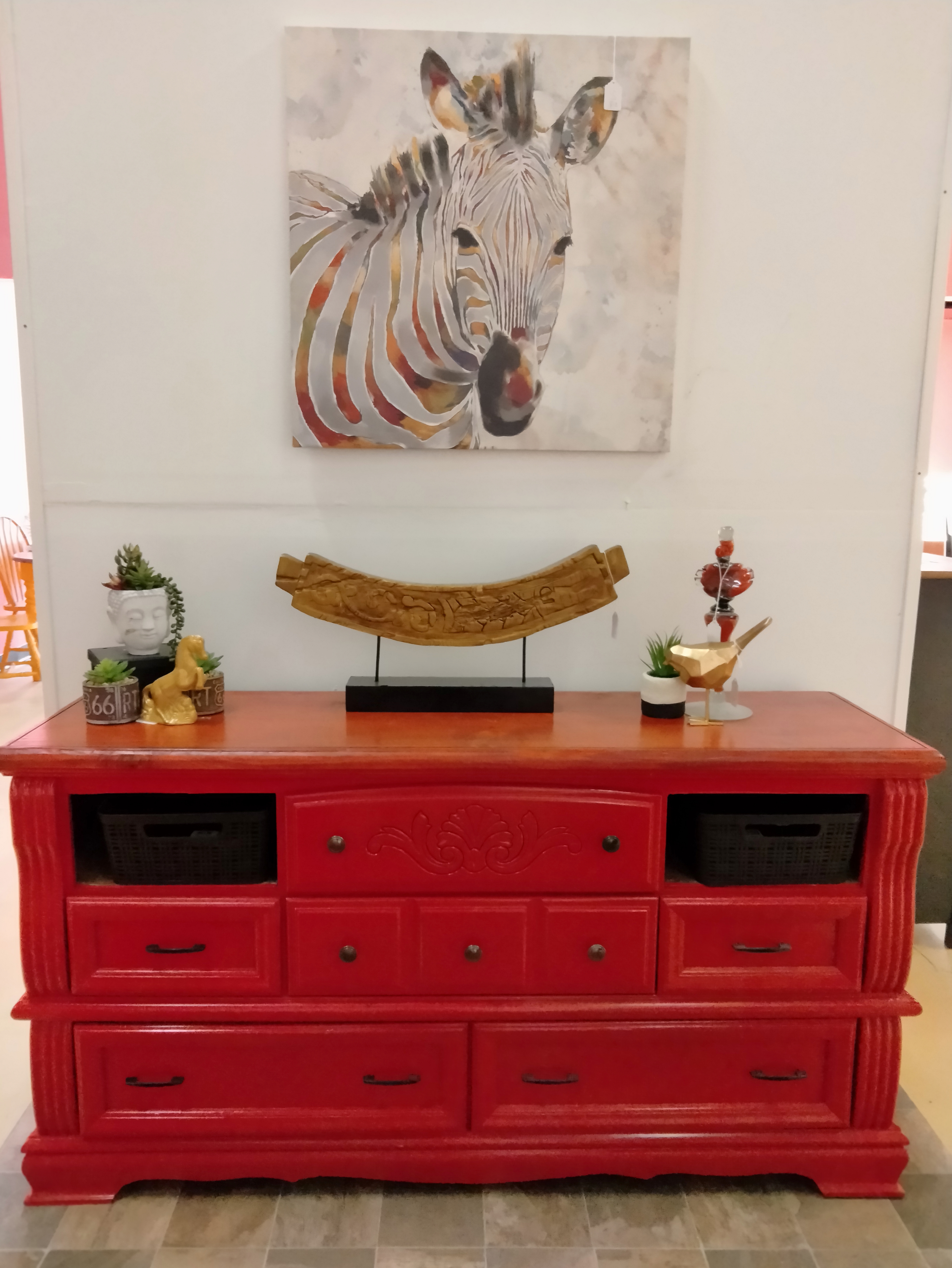 Dresser has painted in Red and the top has been sanded and stained to a beautiful red wood.